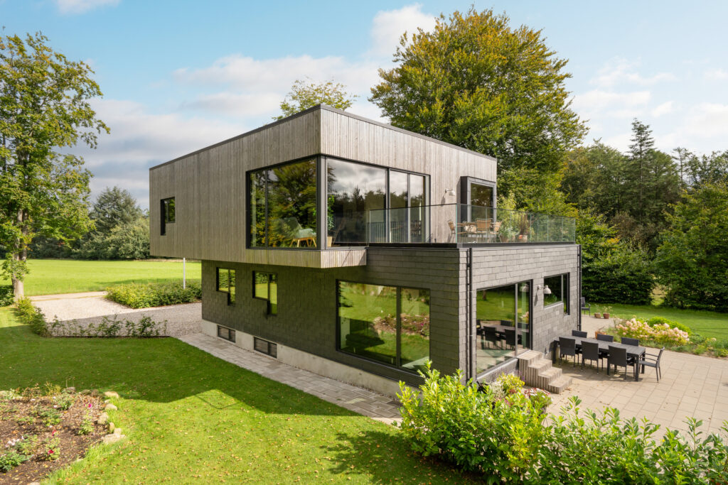 Et eksempel på vores arbejde med bæredygtig arkitektur og byggeri ses blandt andet i den omfattende renovering af en villa fra 1954. Her blev facaderne beklædt med en blanding af Thermowood, et varmebehandlet træ, der er særligt modstandsdygtigt samt naturskiffer, et holdbart og miljøvenligt materiale. En god skitseringsfase gjorde det muligt at træffe bevidste valg om materialer og udtryk, mens de efterfølgende faser sikrede, at bæredygtigheden blev fastholdt hele vejen igennem projektet. Resultatet blev et hus med lavt driftsbehov, lang levetid og et design, der både er funktionelt og æstetisk.